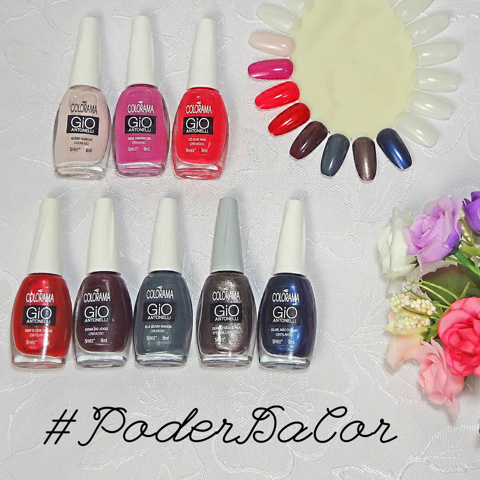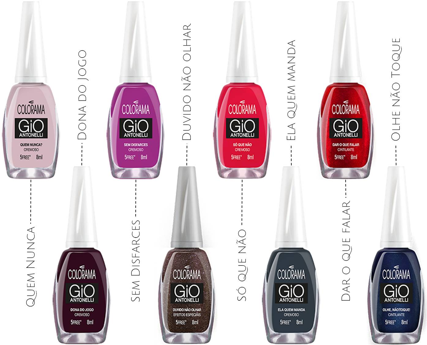 As oito novas cores de Giovanna Antonelli para Colorama estão super lindas. A parceria de sucesso aposta no trend dos cintilantes e metálicos para essa temporada de ‘inverno’ (cadê você frio?). Os nomes continuam divertidos e dentro do tema #PoderDaCor. E a própria Gio palpitou nas escolhas de tons e títulos. A coleção tem 5 tons cremosos base: rosa claro, violeta, rosa, berinjela e cinza escuro; 2 cintilantes: vermelho e azul escuro; 1 efeito especial: marrom com fundo acinzentado e mini partículas de glitter prateado.