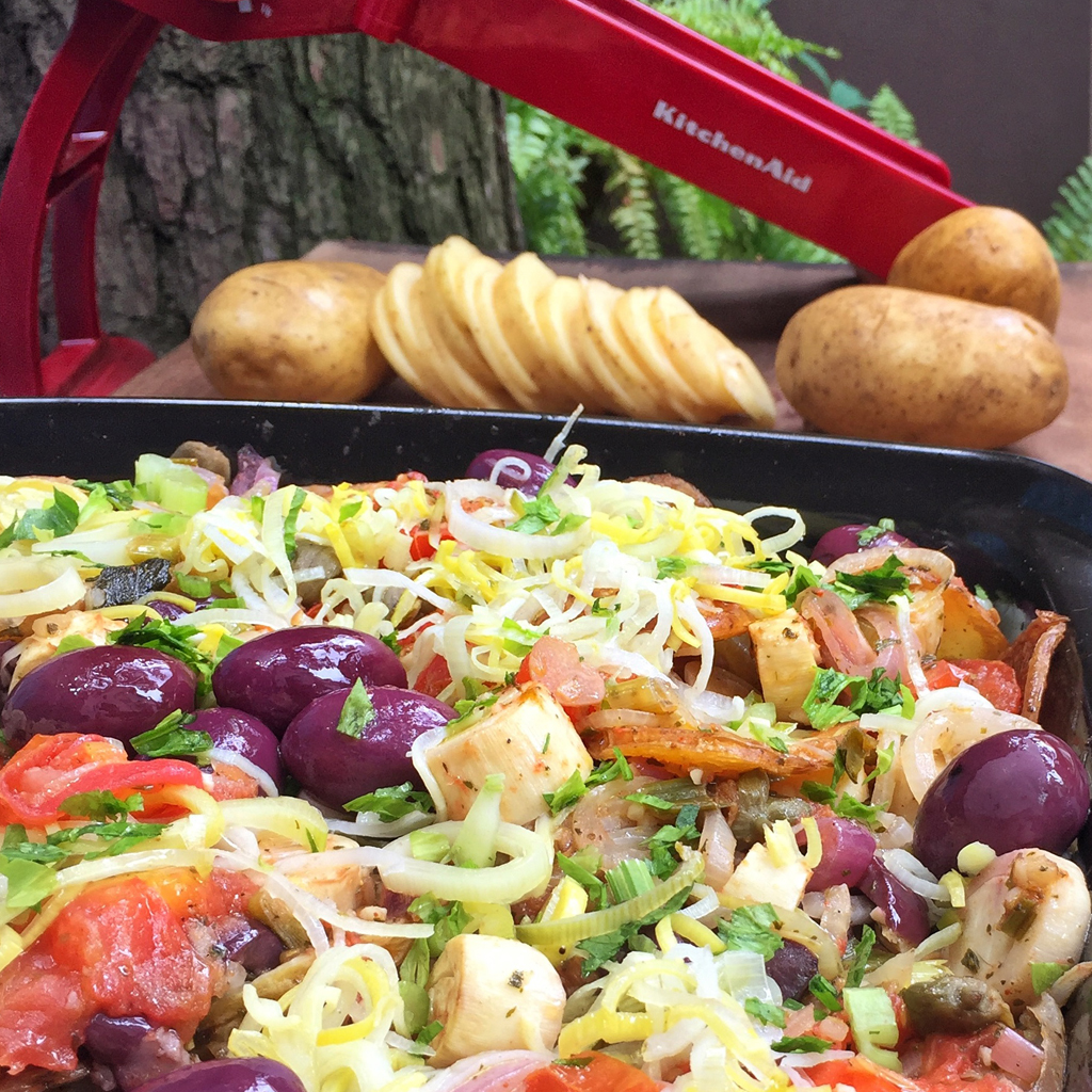 Fatiar as batatas em rodelas e então cozinha-las em água fervendo por 5 minutos. Retirar, escorrer e então levar ao forno temperadas com azeite e orégano até dourarem. Reservar. Cortar os tomates e a cebola em rodelas, tempero-los com chimichurri e assar em forno pré-aquecido a 200ºC por 15 minutos. Adicionar as azeitonas e alcaparras ao palmito. Reservar. Montas a batatalhoada intercalando uma camada de batata e palmito e outra de tomate e cebola até o final da assadeira. Levar ao forno para aquecer e finalizar com ervas e azeite extra virgem.