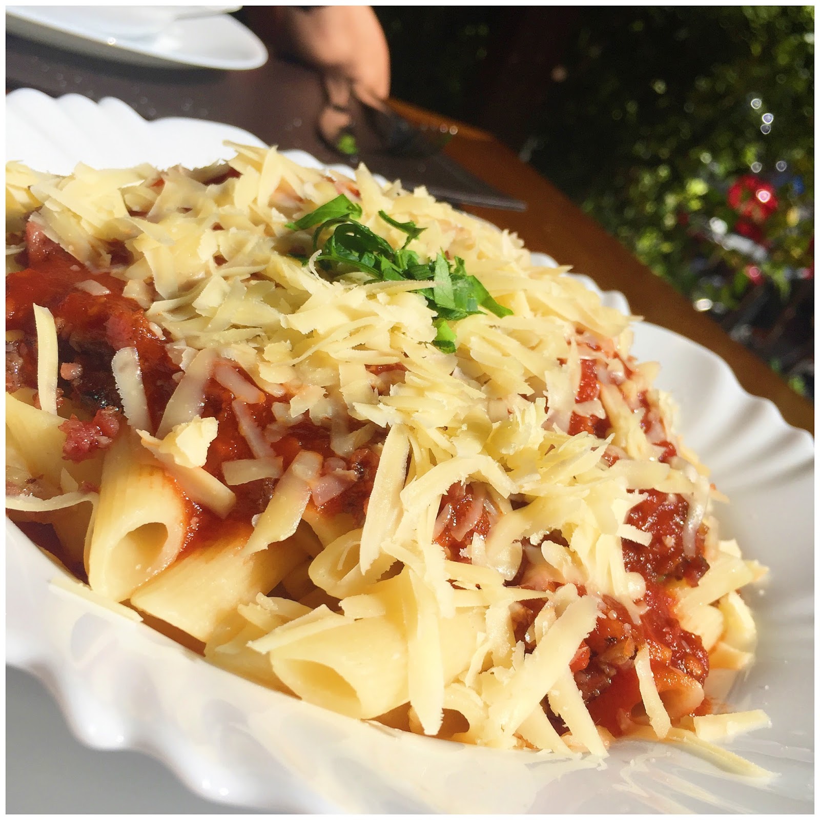 O prato principal vem muuuuuito bem servido e estava maravilhoso: um penne com molho vermelho de calabresa. E queijo, muito queijo! <3