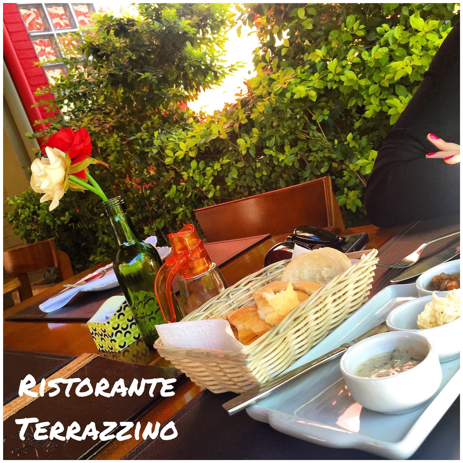 O Ristorante Terrazzino tem um quê de quintal de casa na serra. Ou no campo. Ou na própria Europa. 🙂 Um lugarzinho meeeeega fofo, com mesinhas de madeira, muito verde ao redor, flores nas mesas e….  boa comida! Sim, afinal, é um restaurante e mesmo lindo não iria falar dele caso a comida não fosse boa. 😉 Chegamos por volta de 12h30 e conseguimos sentar na varanda. O dia de sol ajudava muito a compor o cenário. Pedimos o menu executivo deles, que é composto de: couvert, entrada, prato principal, sobremesa e café. Bom, né? Vamos aos pratos!
