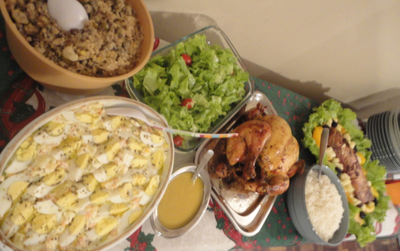 | Nossa ceia: Farofa (da mama), maionese, salada de alface com tomate, perú, arroz branco, lombo e molho de damasco! |