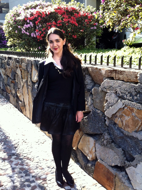 Saia, minha mãe que fez; Tricot, Request; Blazer, Acervo; Meia-calça, Lupo;
