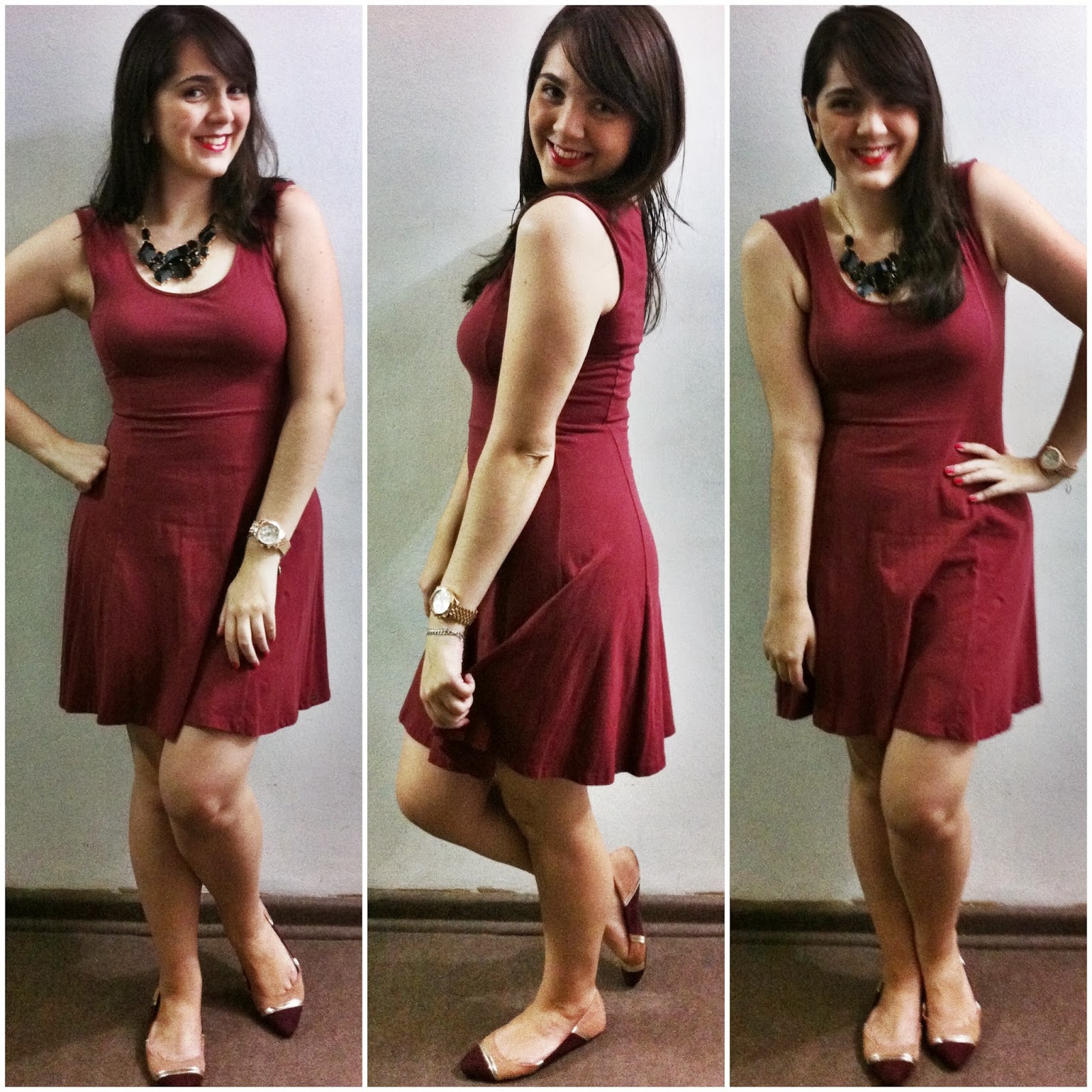 Feliz Nataaaaaaal! Quem me segue no instagram (@mademoiselleparis) viu o vídeozinho que fiz pra vocês numa escapada da celebração de natal aqui de casa. Mas obviamente que hoje eu vinha mostrar o look da ceia, como prometido! ; ) Como passei em casa, escolhi coisas simples, pra ficar confortável mesmo! Mas um conforto não largado/relaxado, se é que me entendem. [risos] O vestidinho vinho é de algodão e super macio. Ótimo para noites quentes. Fugi do salto pois vem aí férias, ano novo e muitas outras ocasiões que ele poderá ser bem utilizado. Em vez dele, fui de sapatilha baixinha e flexível, pra poder me sentir ok de estar de sapatos andando pela casa. (!) E pra dar um charme eu caprichei no colar e no bocão vermelho (tô in love com um lápis de boca novo que comprei). Como o Edu viajou para passar as festas com a família, as fotos ficaram por conta de minha mãe e sobrinhos. Eles me ajudaram super e merecem um brinde por isso! <3