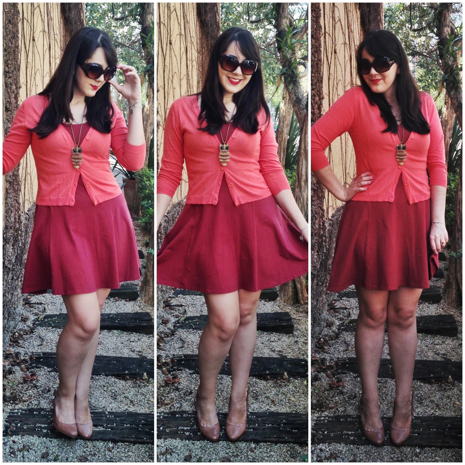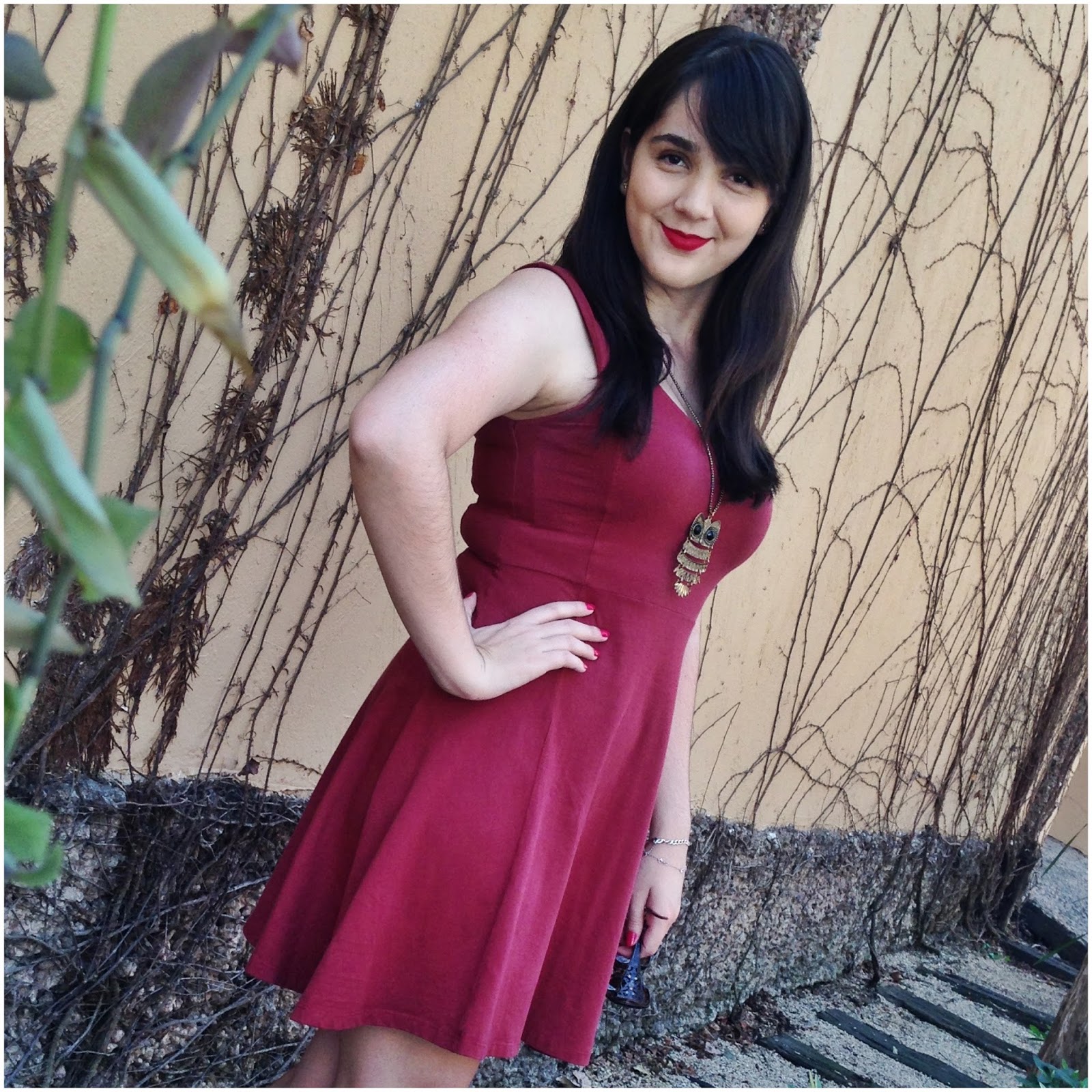 E pra celebrar esse clima de calmaria com que iniciei o mês de setembro, dei uma colorida no look. Aproveitei o tempo quente e decidi por um vestido rodado e gostosinho. Para proteger do ar condicionado, um cardigan leve de cor forte. Lábios rubros de rosa (não adianta, eu amo um batom vermelho seja qual for a estação do ano). E nos pés um scarpin nude bem delicadinho.