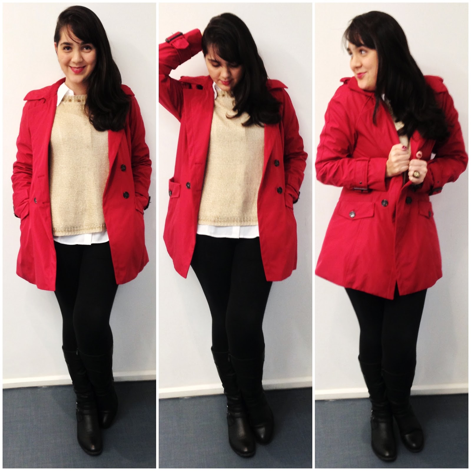 E como o casaco era a peça-chave de tudo, o resto foi basiquinho e neutro, pra não brigar com o vermelho e os detalhes e o amor desse casaco de chuva: combo legging + botas, camisa branca larguinha e tricot. : )