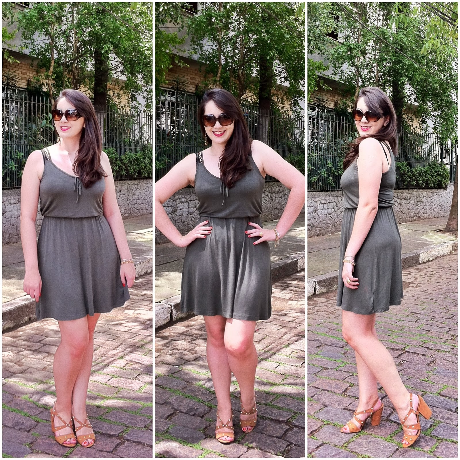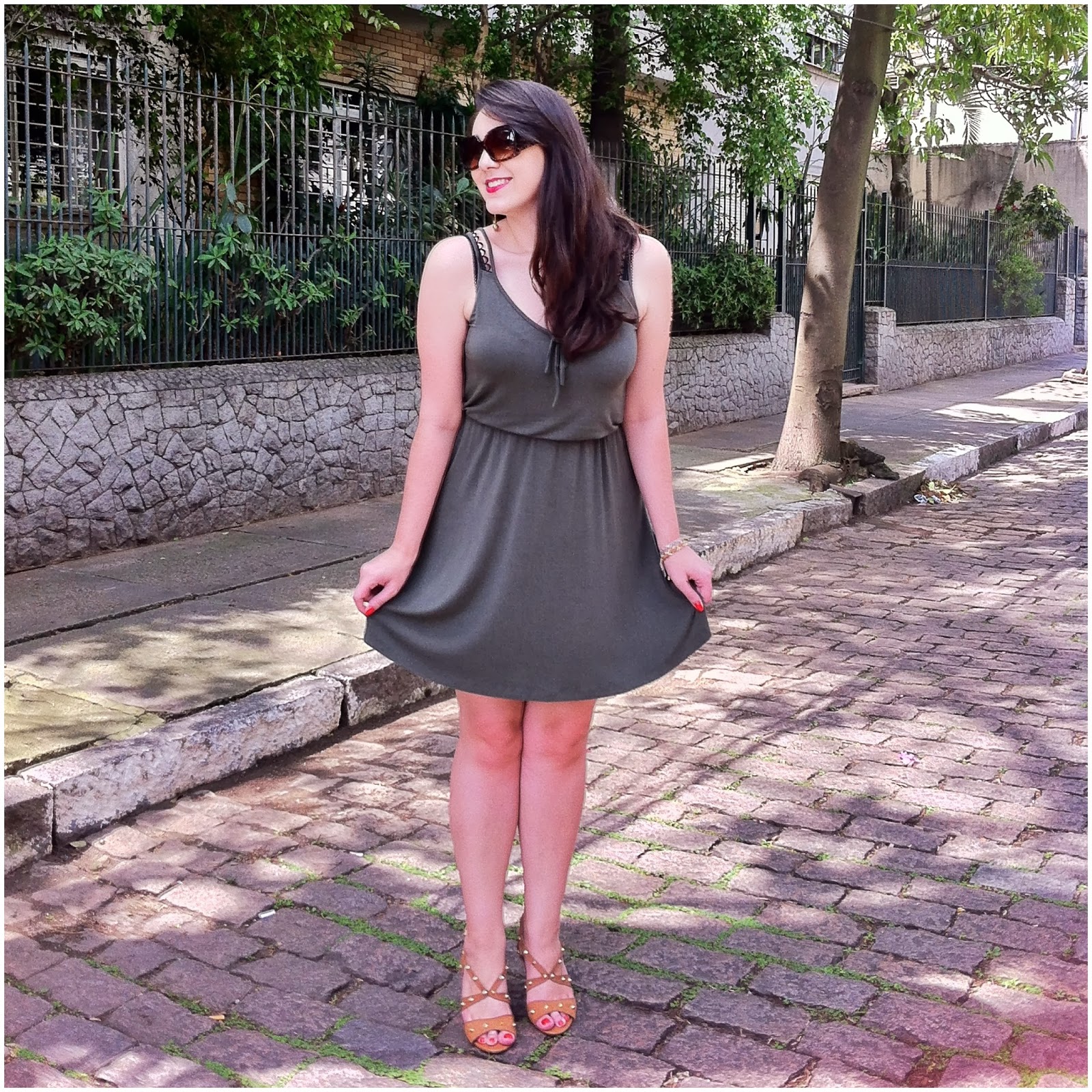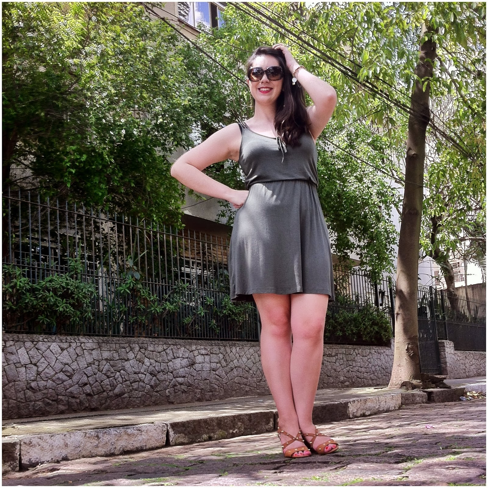 A quinta começou lenta, quente e cheia de sono. Algumas dores no corpo também. Aquelas que clamam pelo fôlego extra de lembrar que a semana está no fim. E que depois de uma quarta-feira com saudosismo do colégio (leiam “eu estava de jeans e camiseta e não fotografei por motivos de prefiri dançar um pouco mais” <3), decidi que queria algo simples e sexy. Simples e confortável. Simples e charmosinho. E obviamente queria algo que fosse super fresquinho. Pois o calor anda de matar aqui na terra da garoa. Tanto, que a garoa virou tempestade de verão e anda inundando as tardes para refrescar o ar. E eu confesso que até gosto disso. Calor e chuva. Ar úmido. Pele quente. Já tô entrando no clima das férias desse jeito…! ; ) As escolhas para me encaixar nesse cenário foram báááásicas: vestidinho fino, sandália de spikes e brincos um pouco maiores, para compensar a total ausência de colares. Adoro esse vestido por achar que ele é ótimo como coringa: combino com váááárias peças do meu armário e sempre sai algo diferente! : )