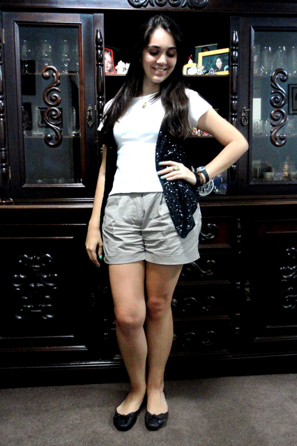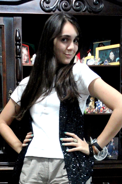 O calor em São Paulo continua castigando… então hoje eu fui livre, leve e solta: shortinho, camiseta e sapatilha. E um coletinho de paetê que era pra dar um charminho!