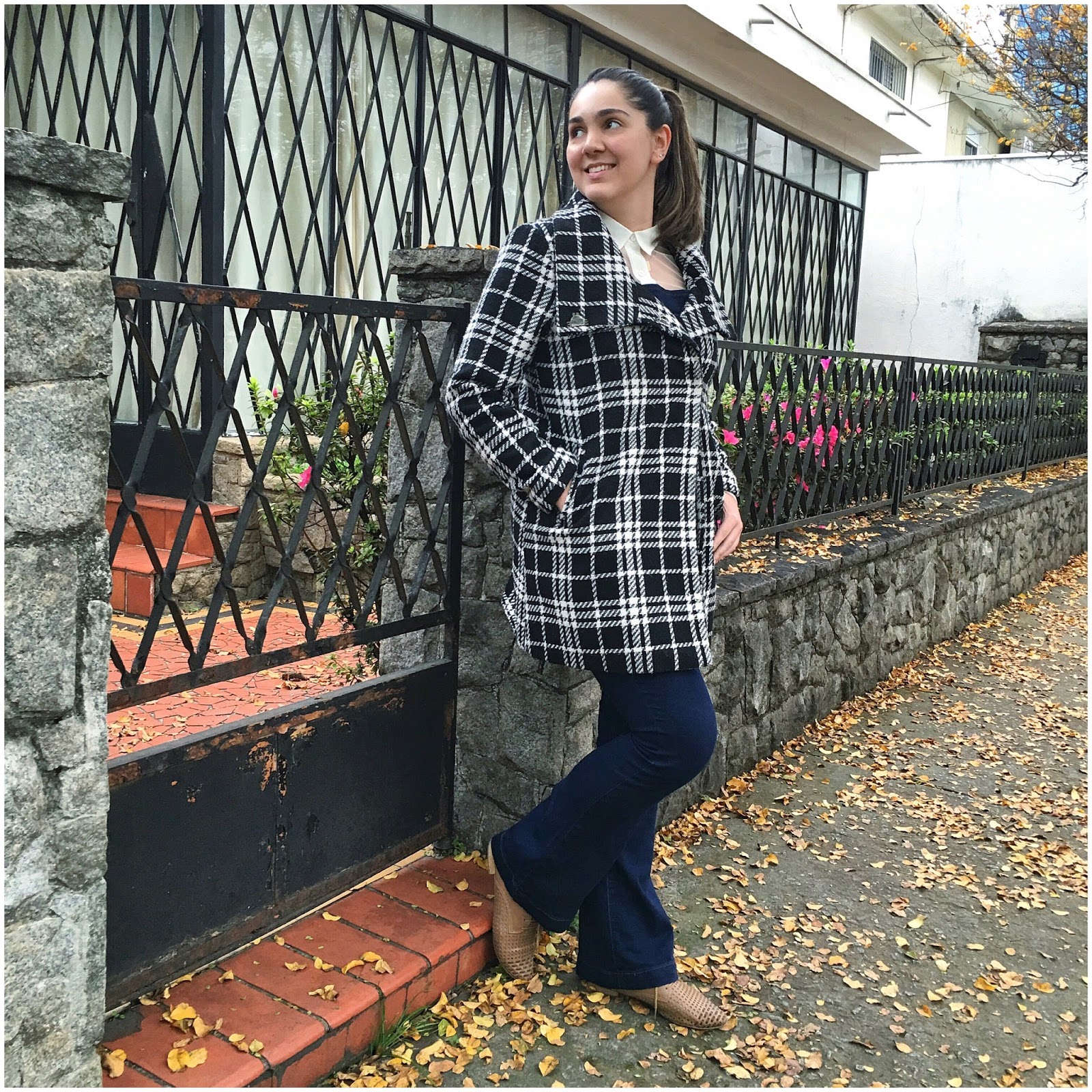 Depois de alguns ‘tira e põe’ de roupas, pensei em reviver essa jardineira/macacão. É super grossinha, perfeita para dias mais gelados. Combinei com uma camisa fina e rendada para quebrar um pouco. Como ela era um bucadim transparente, assumi um top florido por baixo. Cabelo preso em um rabo de cavalo maroto e alto e… um oxford preppy nos pés. Por cima, um casacão bem fofinho e com bolsos, pra arrematar o look e proteger do vento gelado na rua… 🙂