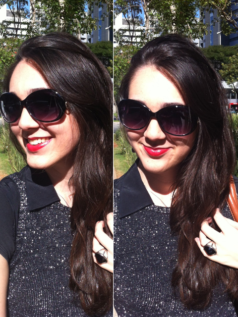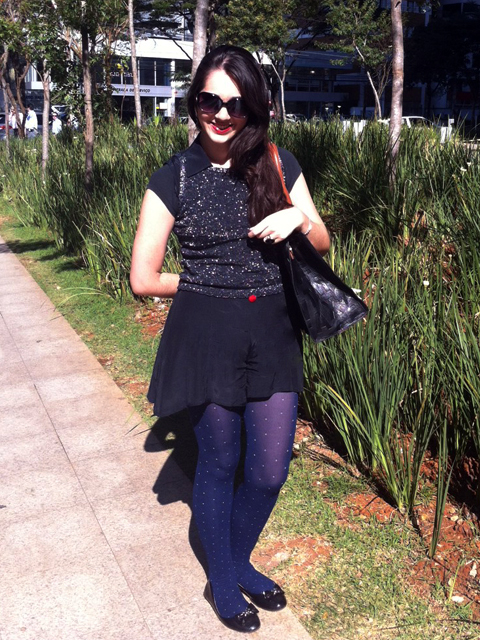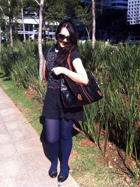 Look de quarta com felicidade de sexta – macacão do meu baú de teatro, meia azul de bolinhas, tricô com brilhinho, bolsa gigante e óculos de sol. Vontade de sair saltitando, não fosse eu ter sido pega por um chato de um terçol. E é por isso (e também pelo sol, obviamente), que esse e os próximos looks que postarei aqui estarão assim: todos trabalhados no óculos escuro! 😉
