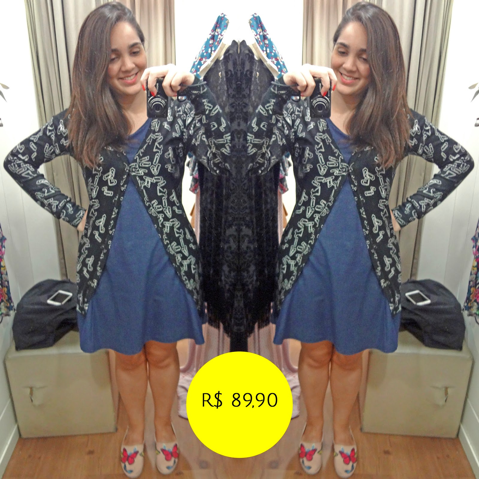 No dia da pré-venda eu olhei pra esse vestido e brochei: achei pequeno e que não iria entrar em mim, então nem peguei. Já essa semana, a Dani que estava na loja comigo falou “Camis, prova esse!”. Olhei, torci o nariz mas pensei “já tô levando tanta coisa pro provador, porque não?”, e fui.