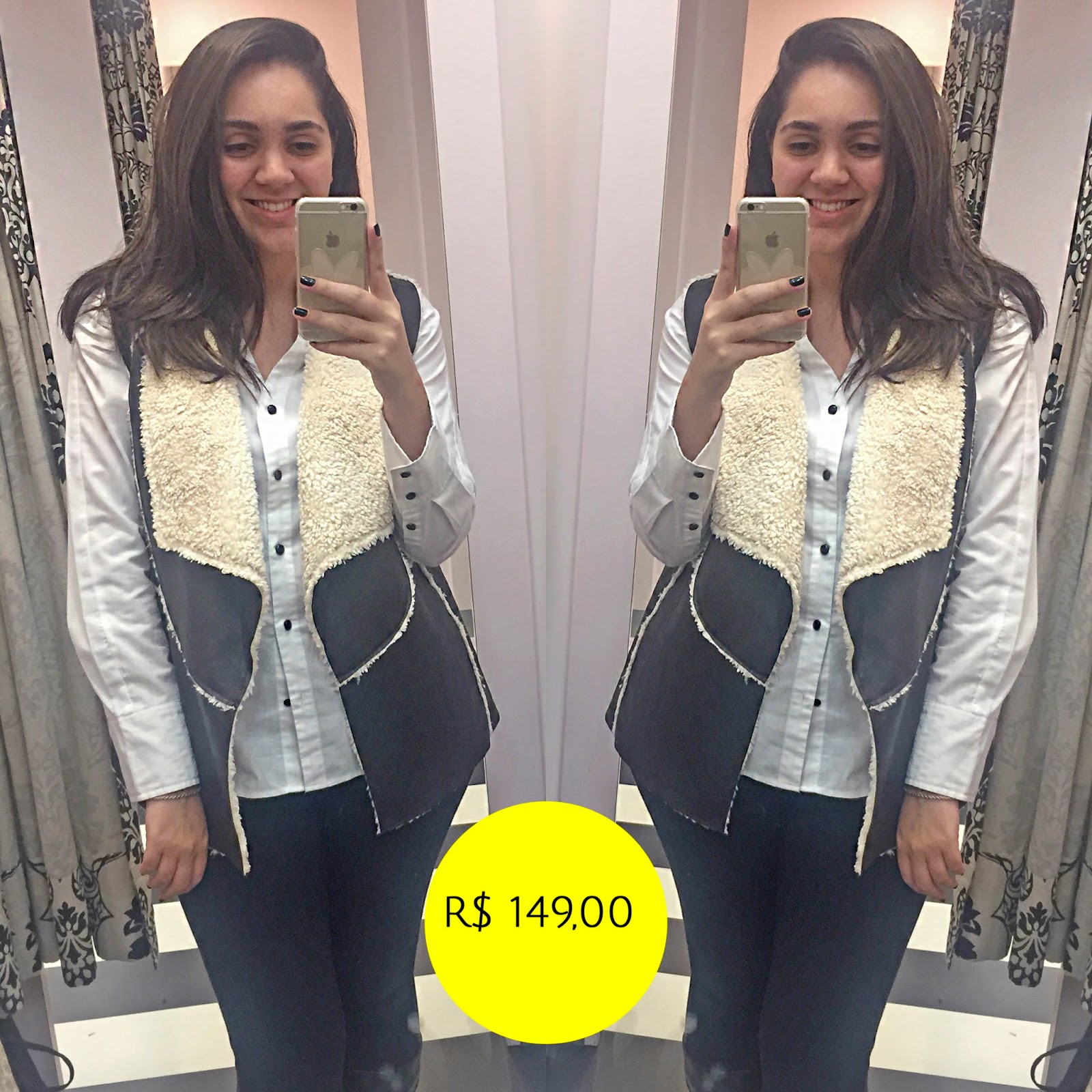 E por fim, esse colete. O QUE É ESSE COLETE, PRODUÇÃO? Gamei nele. Sintético, óbvio, mas super (SUPER) quentinho. E super estiloso né? Acho uma peça super boa e durável com um preço bem bacana. Fica a dica meixxxxmo! 😉