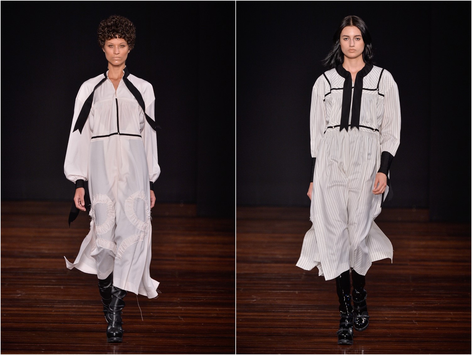 E começamos a ver o peso dos tecidos, contrastar com a leveza das modelos. A beleza do desfile, assinada por Celso Kamura e Robert Estevão, conversa super bem com esse universo bipolar.
