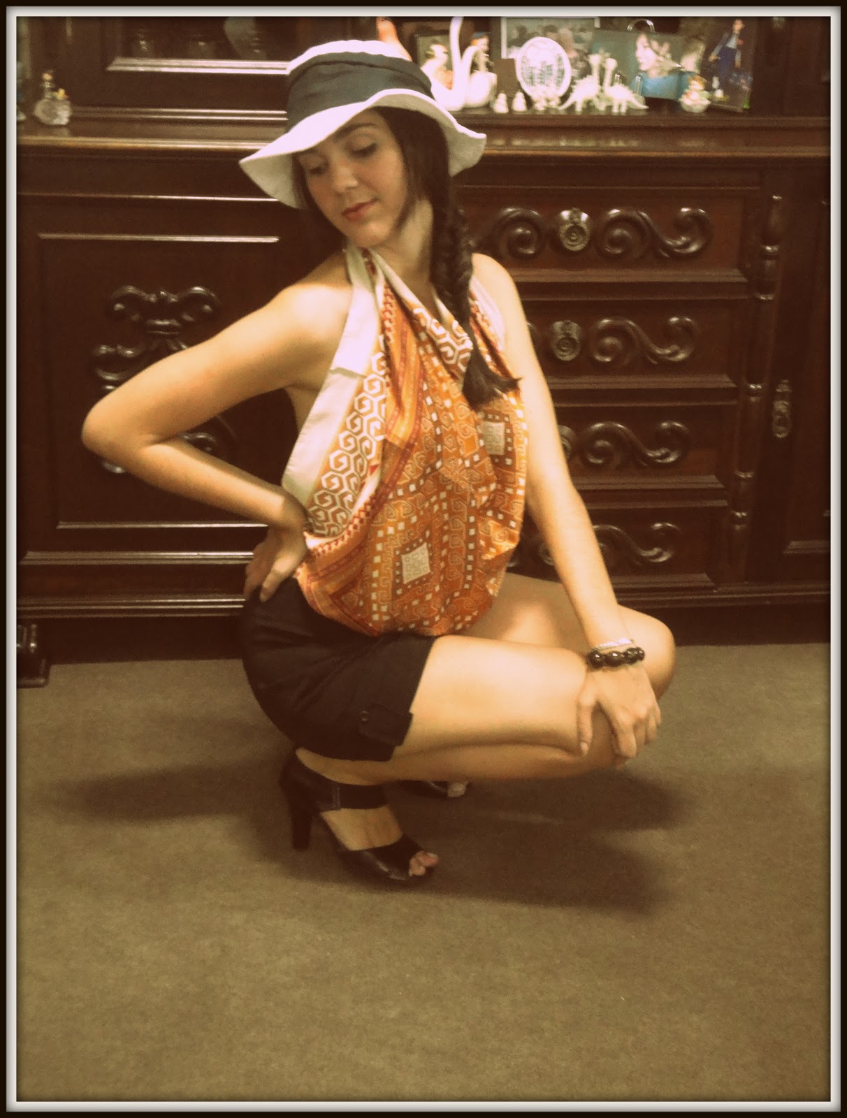 | Lenço, Hermès; Bermuda, Acervo; Sandália, Arezzo; Chapéu, era do meu pai |