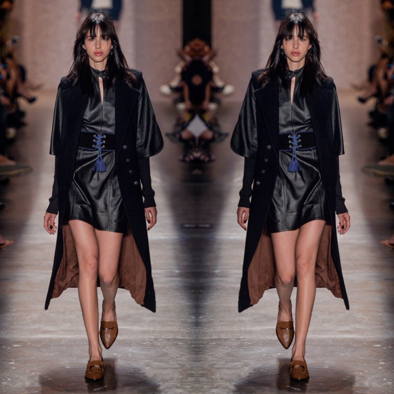Esse look do desfile de Lilly me chamou atenção por trazer um colete ser longo sobrepondo uma peça que eu já amo: vestidinho de couro. <3 Destaque para o cintão tendência que eu super torço para voltar também! Os sapatos com pegada mais masculina deixam tudo mais moderno. Curtiram?