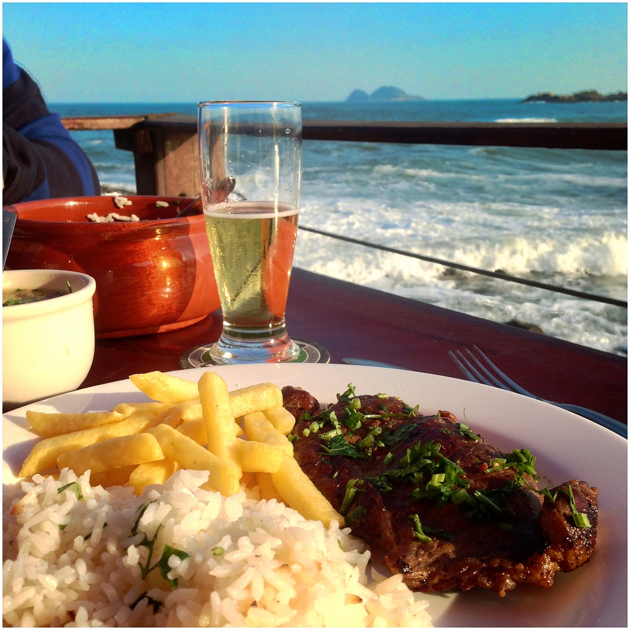 | Contra filé suculento, acompanhado de arroz branco, batatas e vinagrete. E a vista….. |